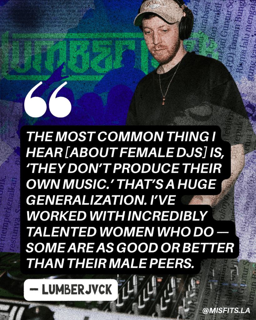 For Insomniac Radio host Connor “LUMBERJVCK” Schatzel, masculine and feminine worlds have never been far apart—more like a few vogues away. Living in Arcadia with his girlfriend and day-to-day manager Mikayla, Schatzel has built a reputation in the dubstep scene for balancing bass-laden power with an unexpected sense of play. One example? He’s an unabashed fan of voguing—ballroom dance culture rooted in Black queer communities.